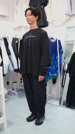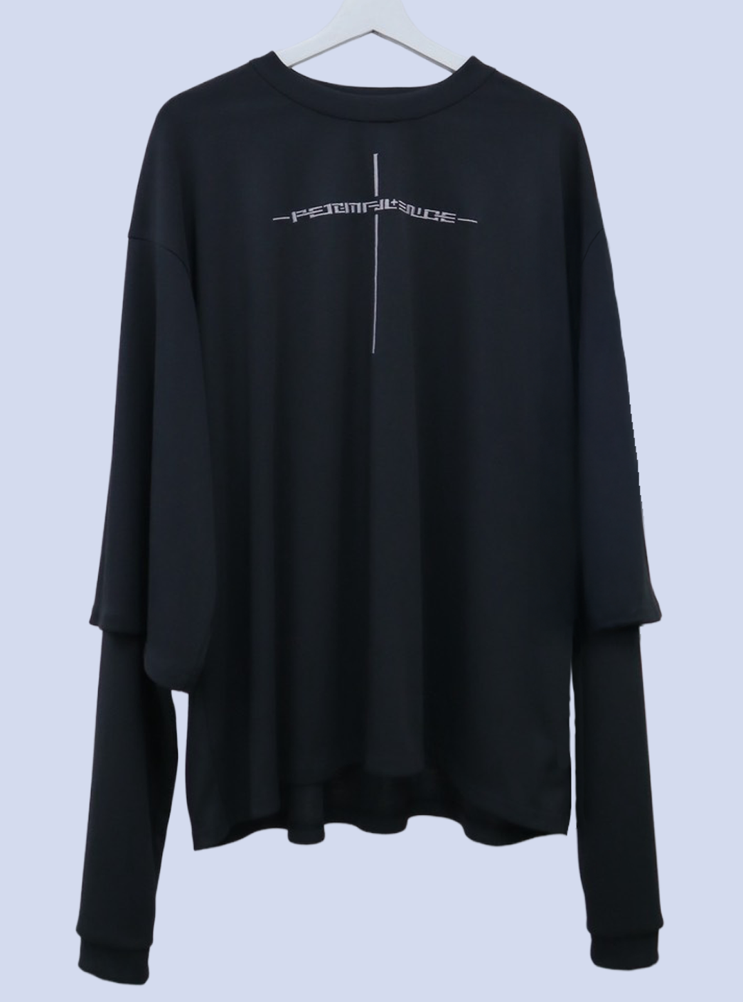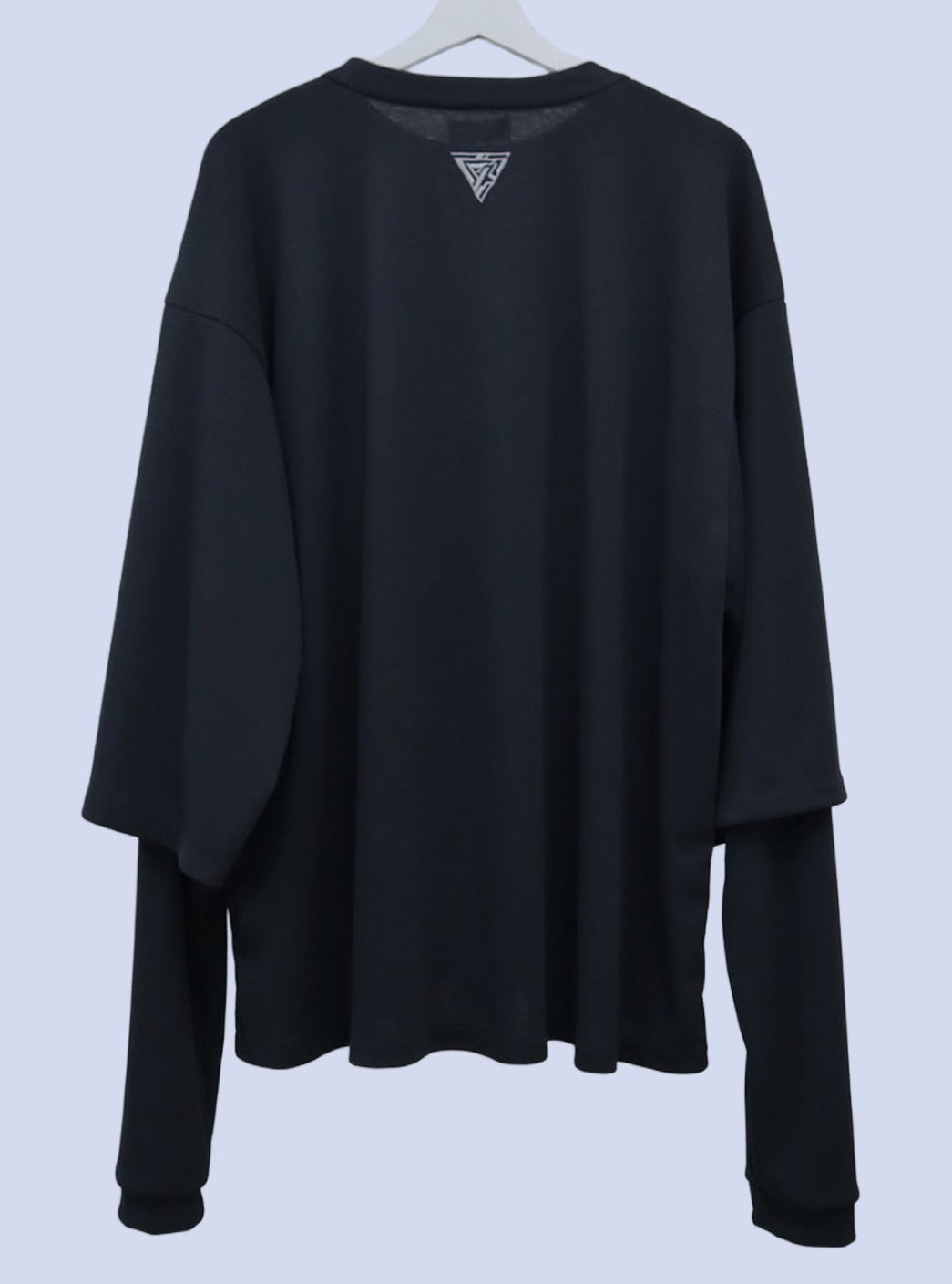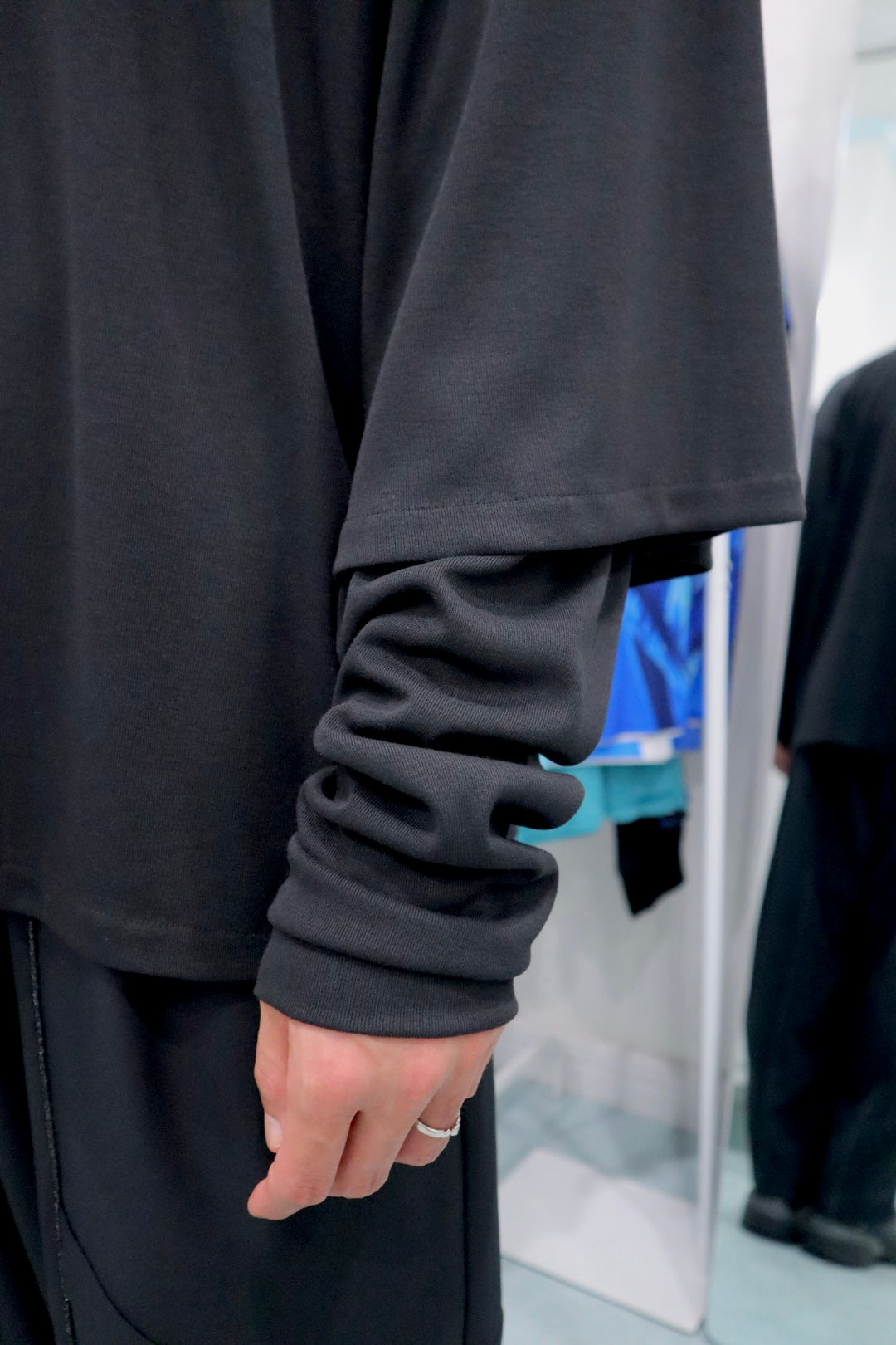 ■ゆったりとしたシルエットで、長袖と半袖が重なったデザインのロンTです。袖はかなり長くなっており、手首でくしゅっとさせてアームカバーを付けているように着ることができます。