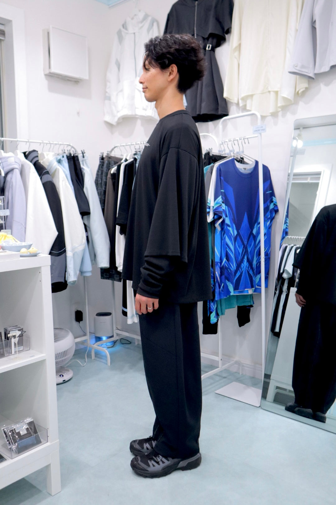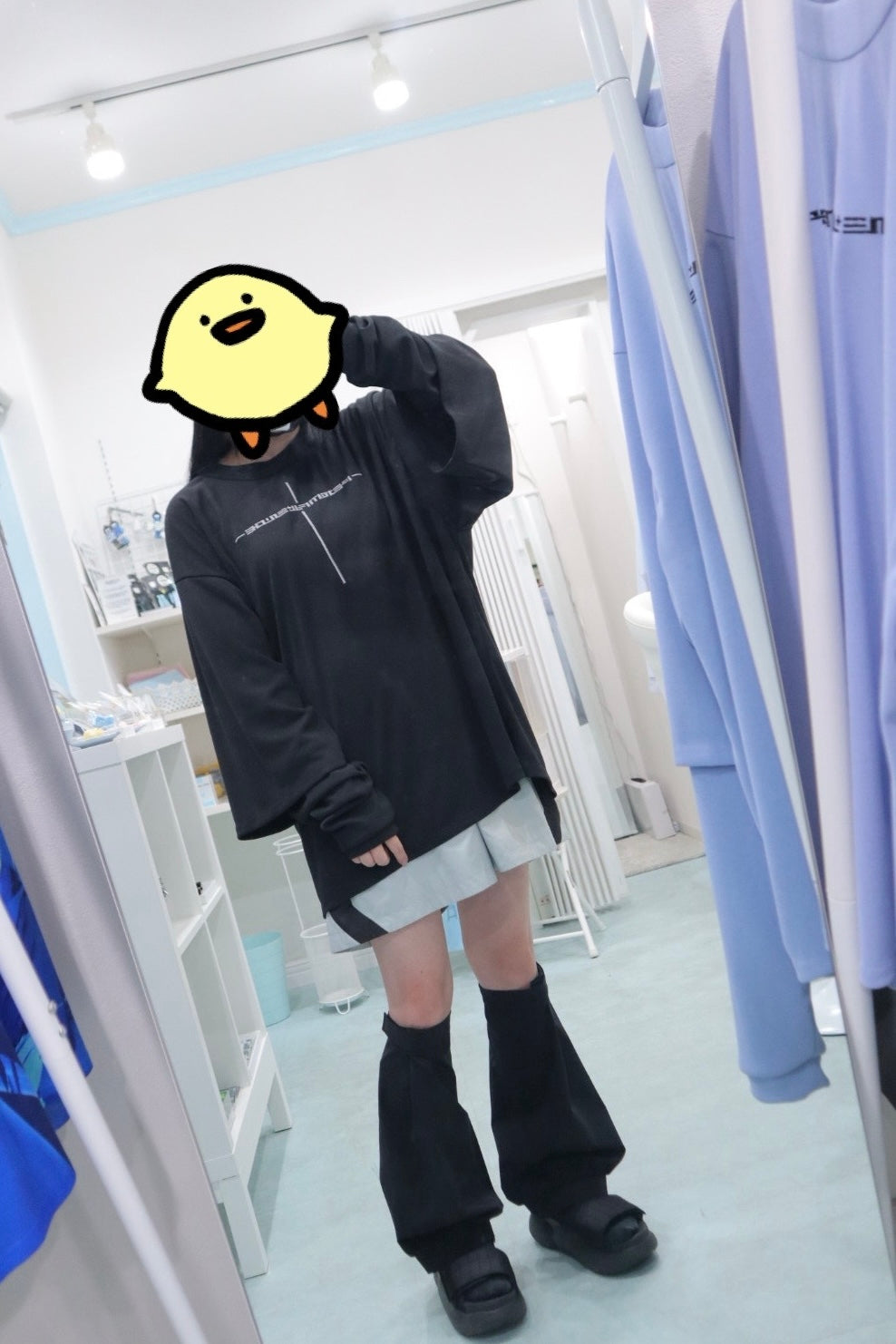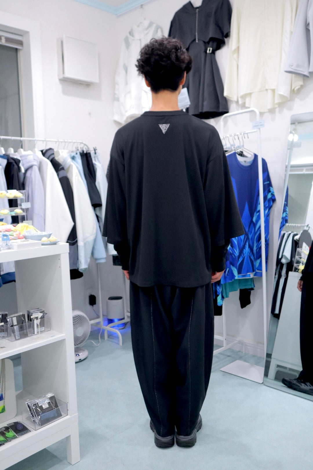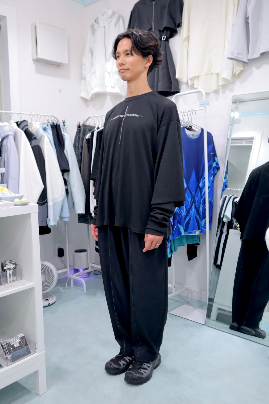 ■ゆったりとしたシルエットで、長袖と半袖が重なったデザインのロンTです。袖はかなり長くなっており、手首でくしゅっとさせてアームカバーを付けているように着ることができます。