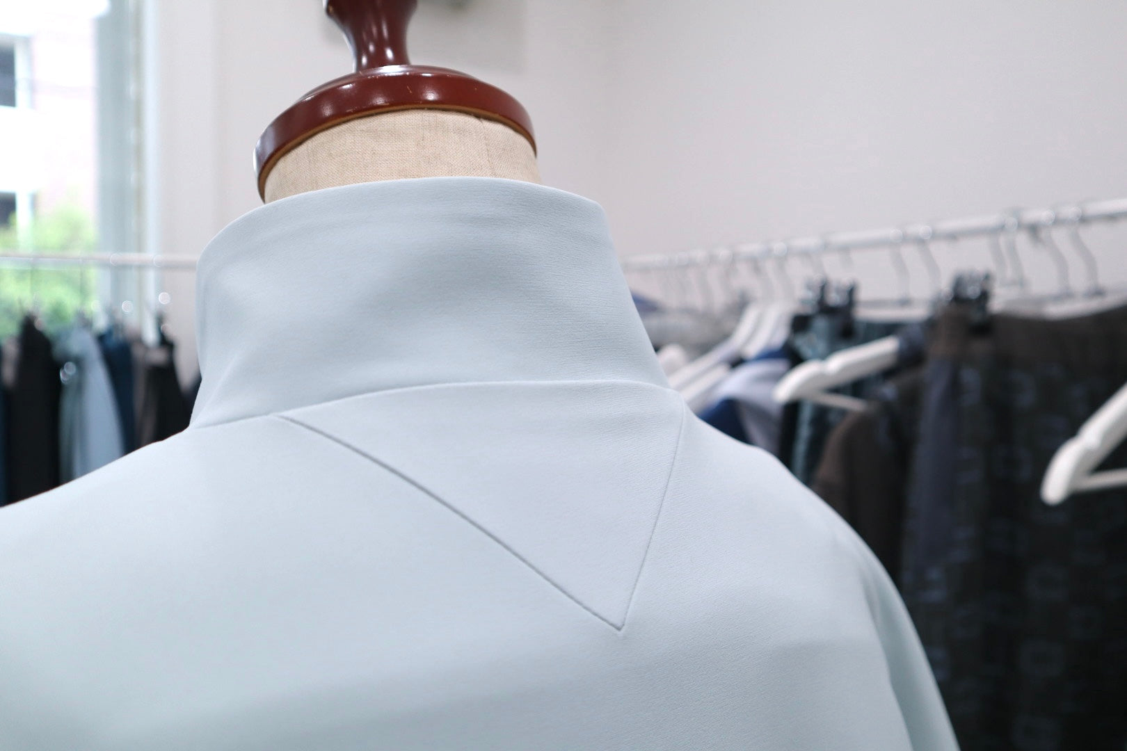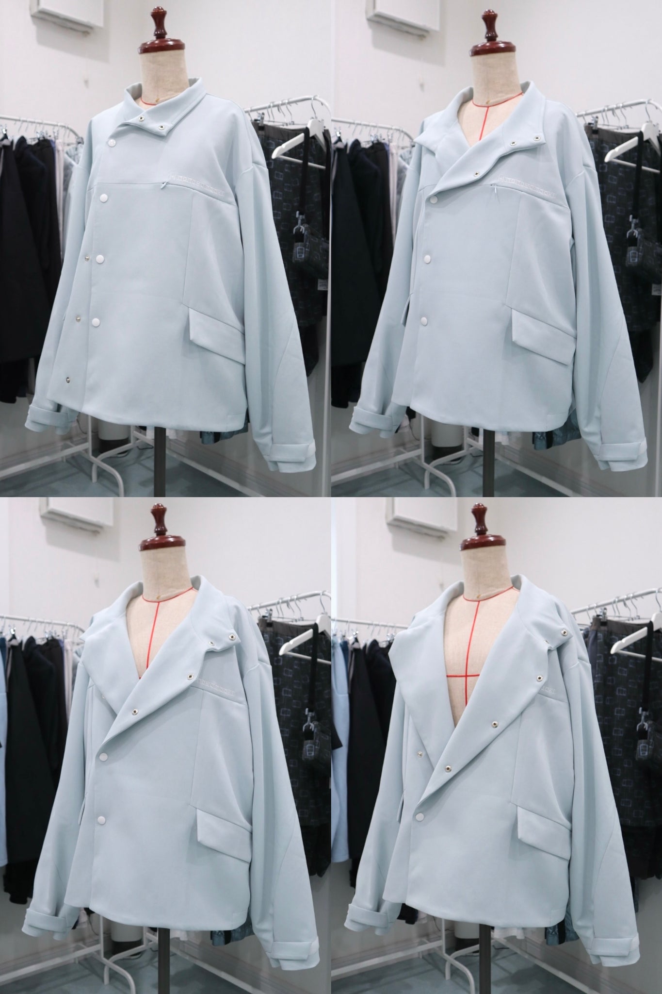 ■ボタンを全て閉めるとハイネックの形になりますが、ボタンをあけて衿を広げるとジャケットっぽく着ることもできます。ボタンをとめる位置によっていろいろな着方ができます。中にフード付きのパーカー等を着たい時は、後ろの衿を折れば重ね着もできます。